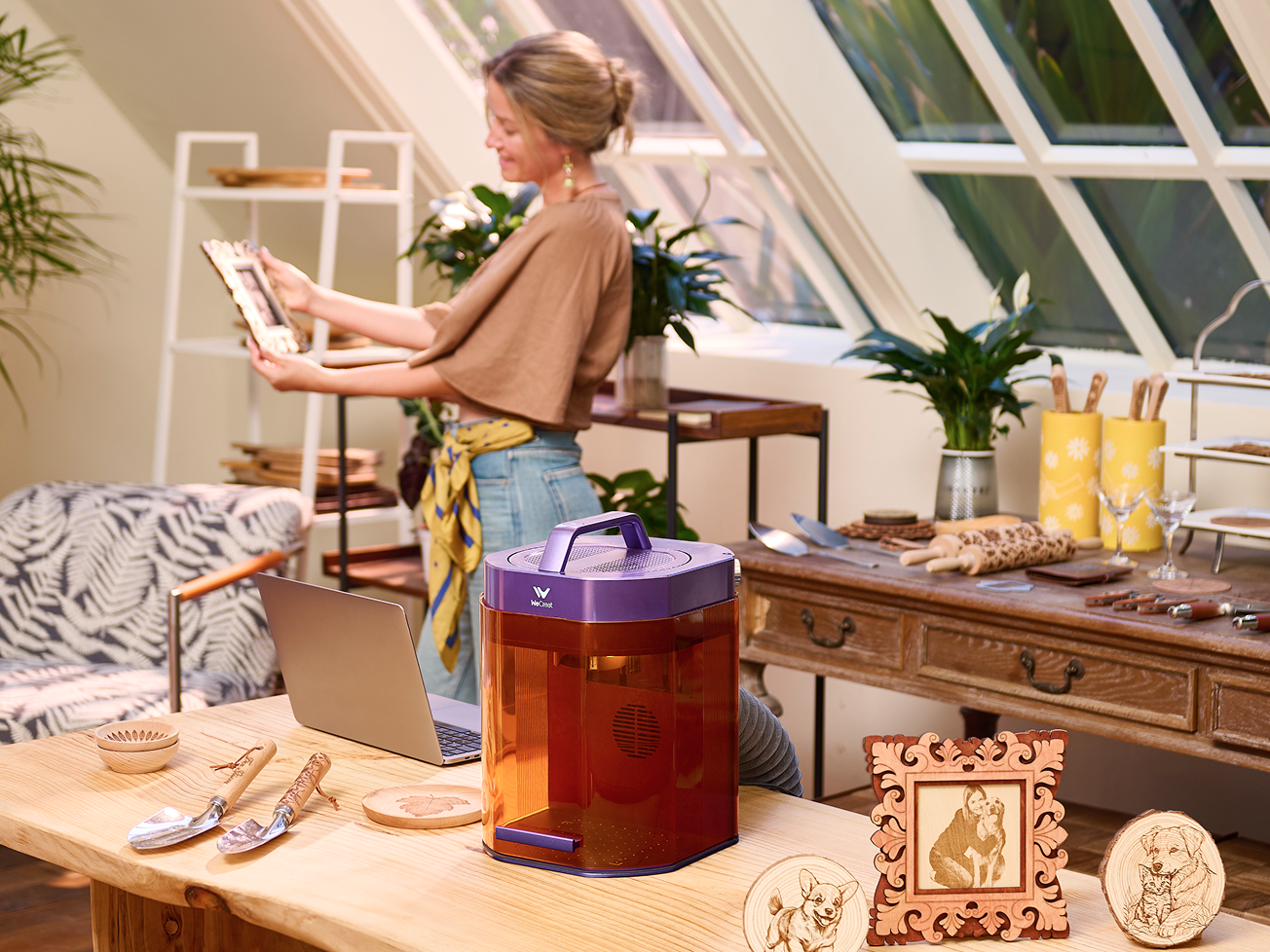 The 0.08mm beam engraves 8K-level detail across wood, acrylic, leather, glass, and metal. With a 19.7"×12.6" working area expandable to 137" via slide extension, Vision Pro supports large projects and batch production.