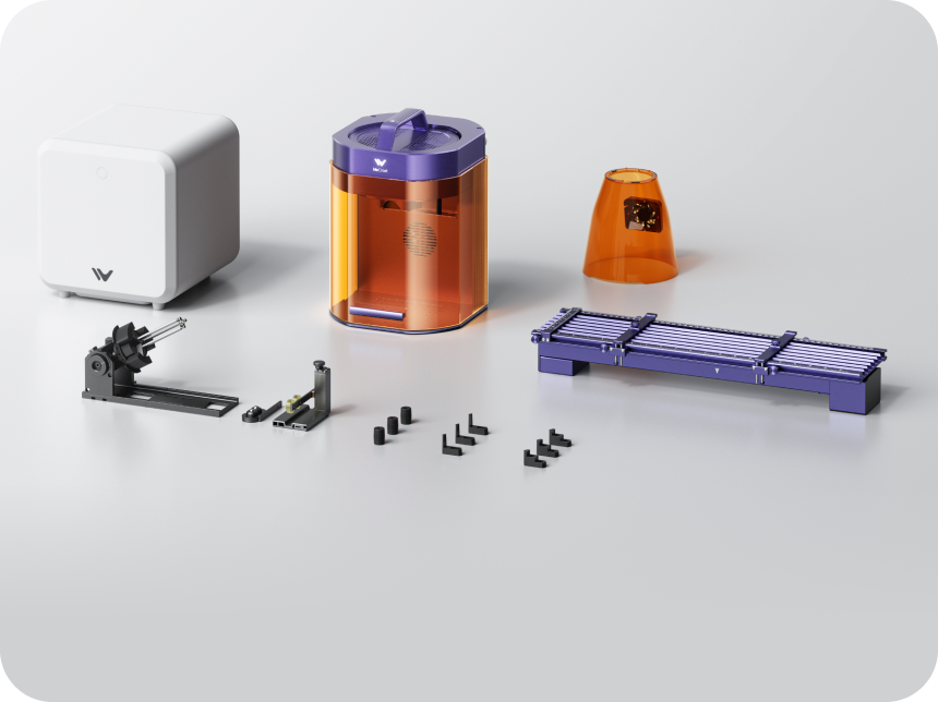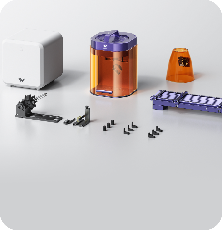 The 3W Infrared Laser Module delivers exceptional results on metal surfaces, the Rotary Pro enables precise cylindrical engraving, the Air Fume Extractor maintains a clean workspace, and the Auto Pass-Through Feeder enhances efficiency with seamless workflow integration.