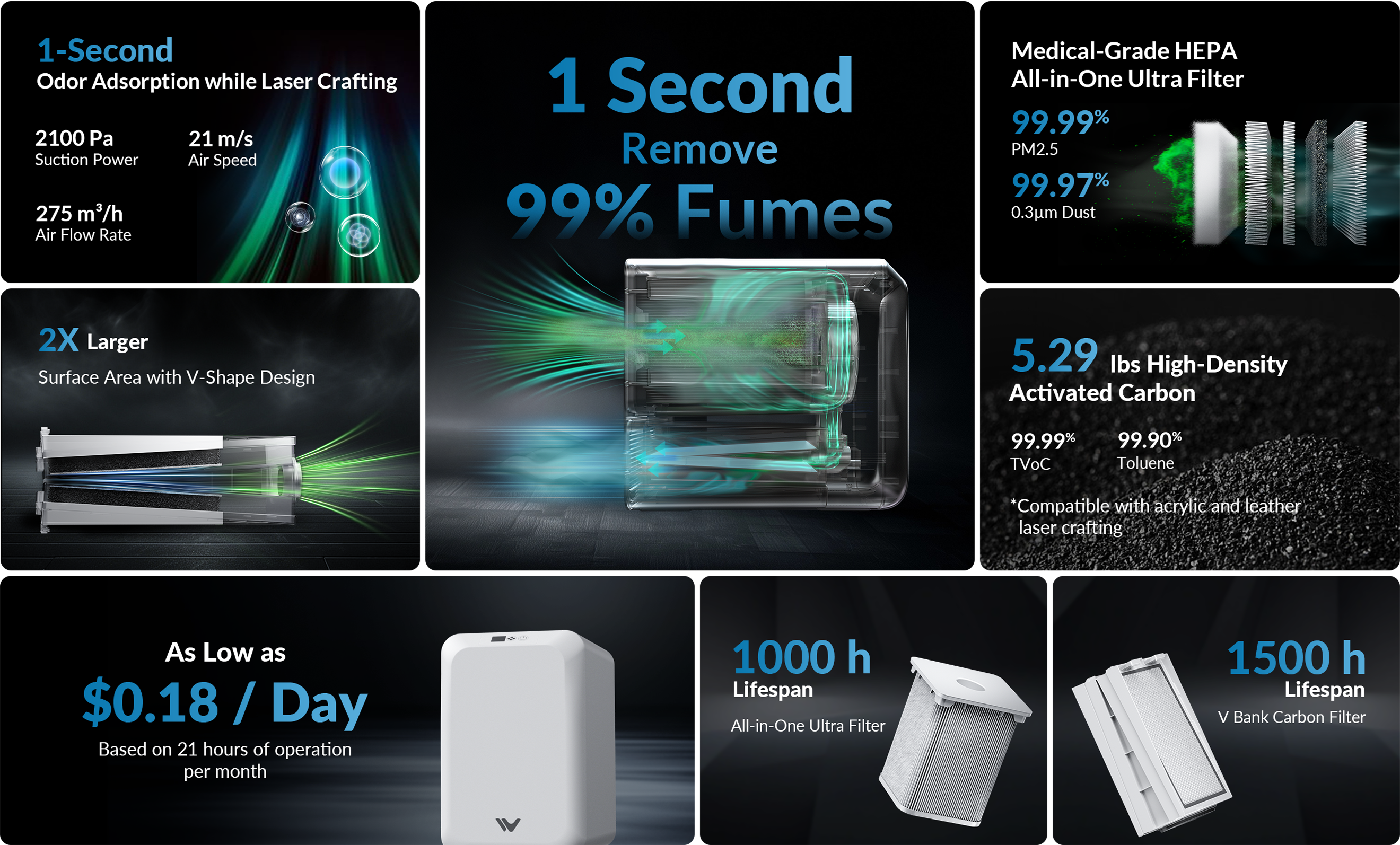 - Medical-Grade HEPA All-in-1 Filter: Achieves 99.99% removal of PM2.5 particles and 99.97% elimination of 0.3µm dust, delivering medical-grade air purification for a safer workspace.
