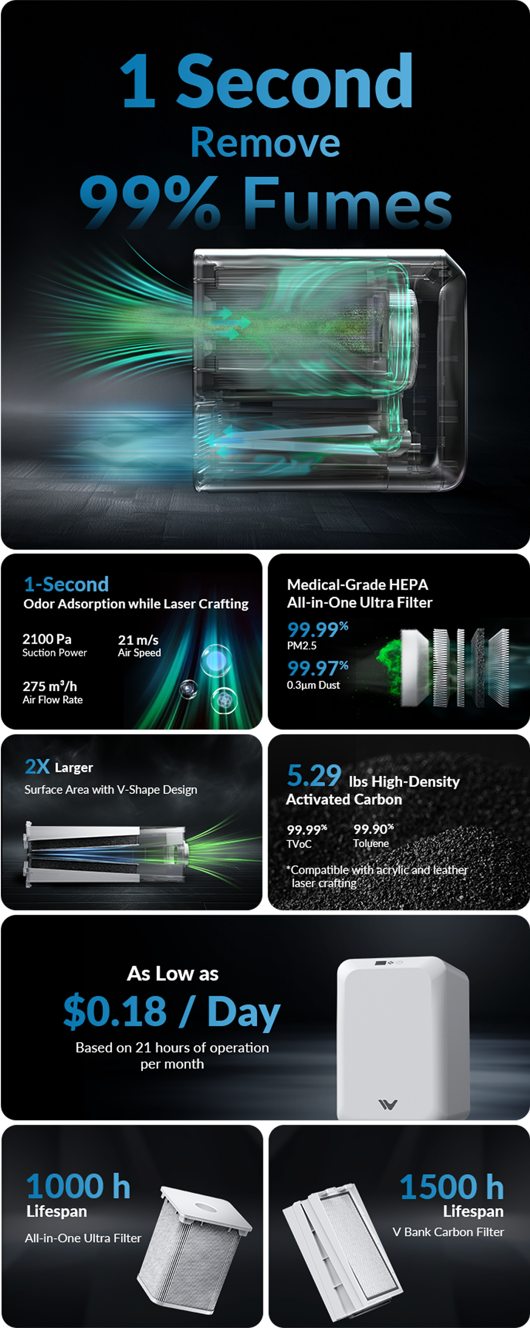 - As Low As $0.18/Day: Operates at approximately $0.18 per day, with filter lifespans reaching up to 1,000+ hours, offering both efficiency and affordability for continuous use.