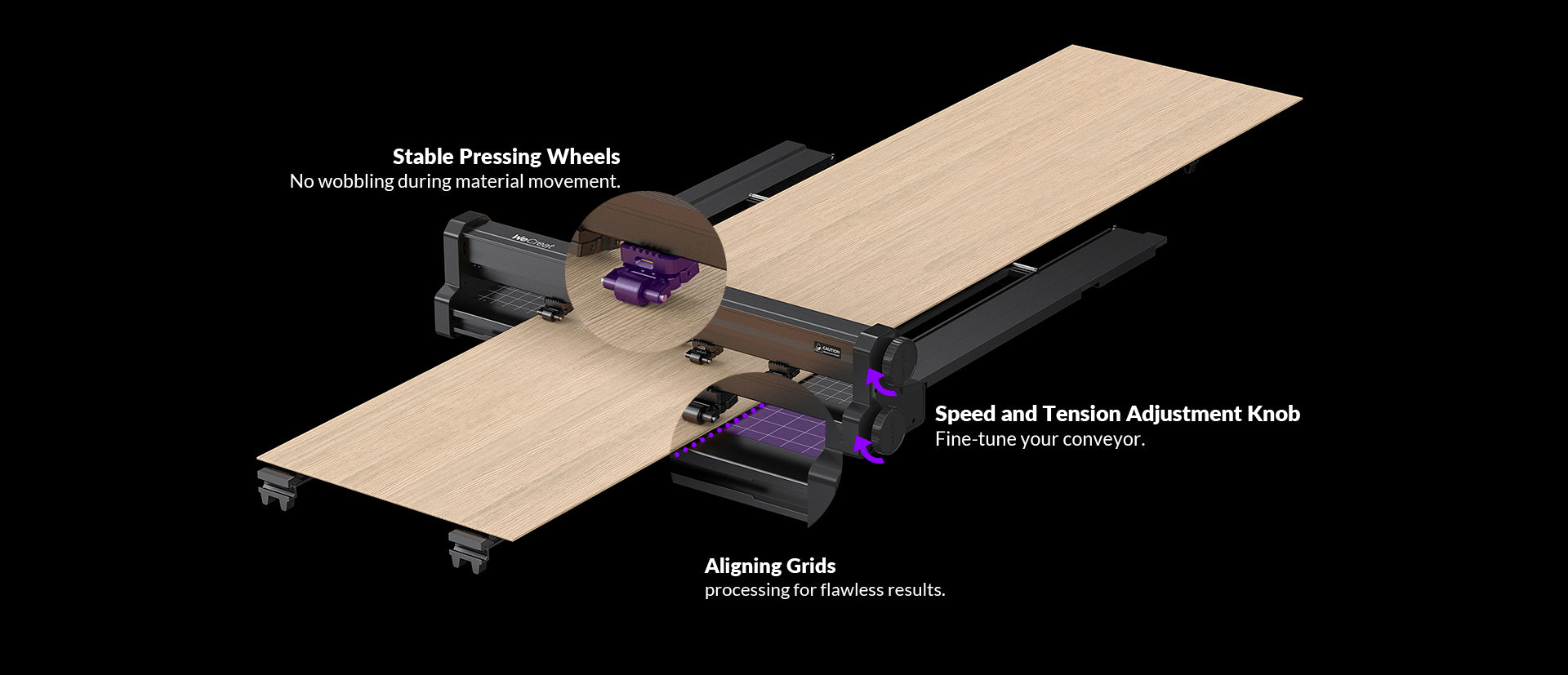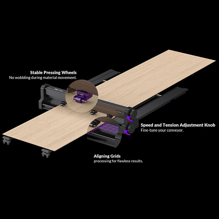 Assemble the main unit quickly and easily—just a few screws and snap the rails into place. No disassembly or complex attachments required. Remove the crumb tray, set your laser cutter on the Passthrough Conveyor, and you’re ready to go.