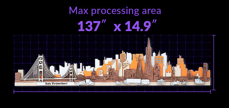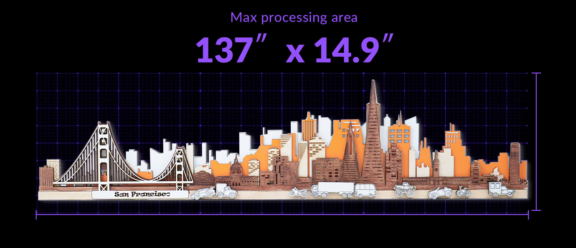 Experience the freedom of an expansive 145.67" × 18.1" canvas. Engrave and cut longer materials with ease and efficiency, handling larger volumes in a single run.