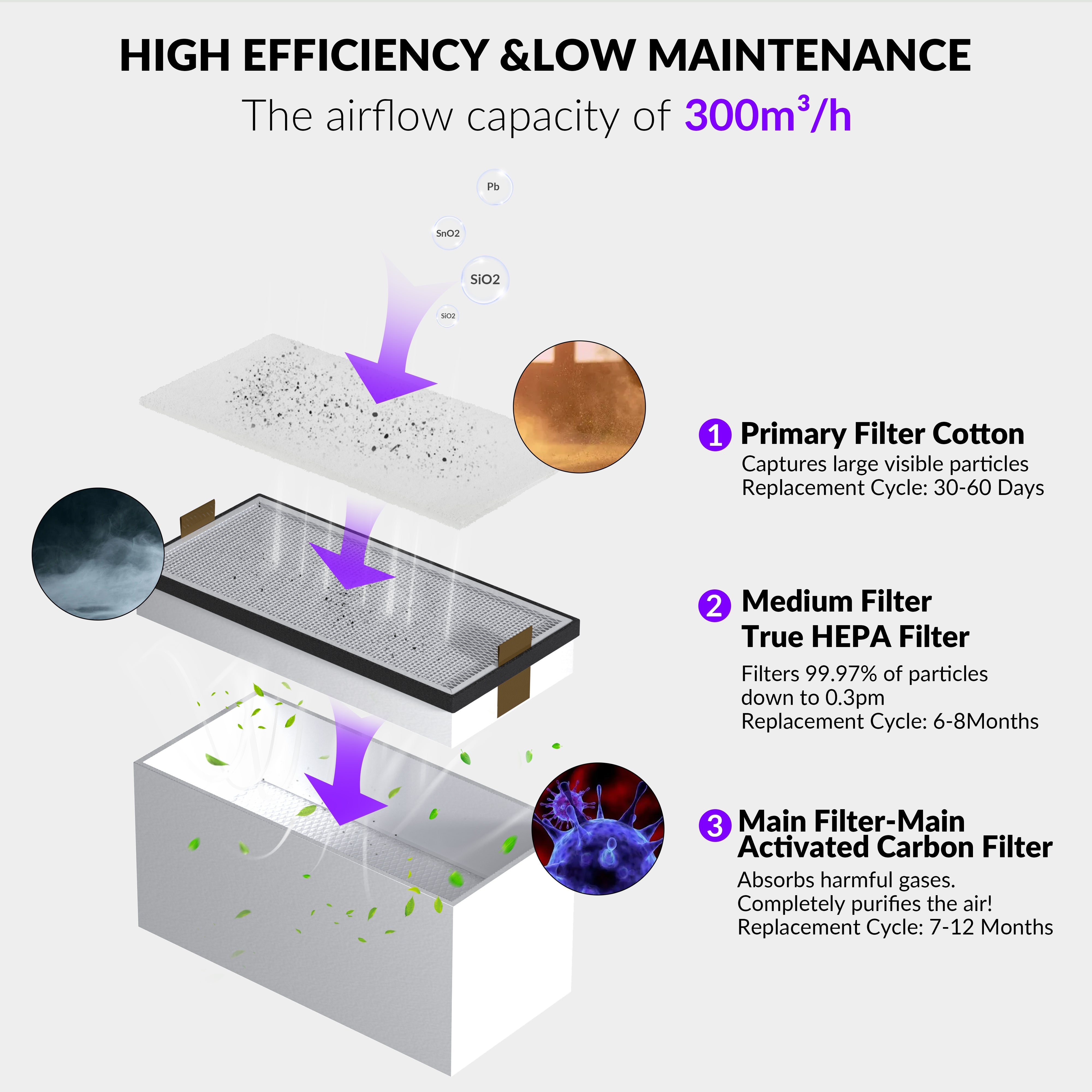 - 3-layer filtration achieves a purification rate of 99.97%, allowing the purified air to be released directly into the indoor.