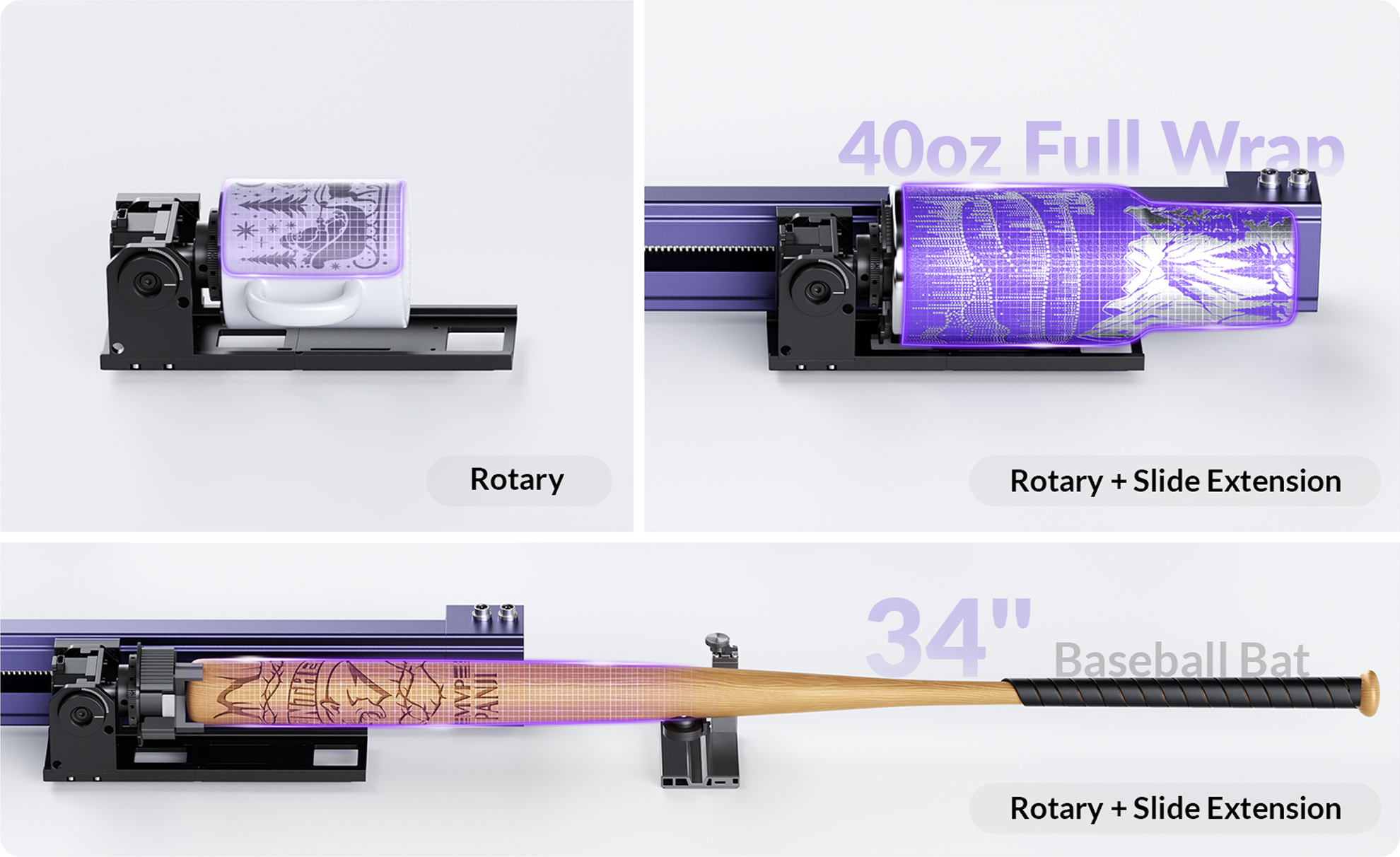- World’s First Rotary + Extension Combo: Engrave cylindrical objects up to 34 inches long, from tumblers to full-length baseball bats.