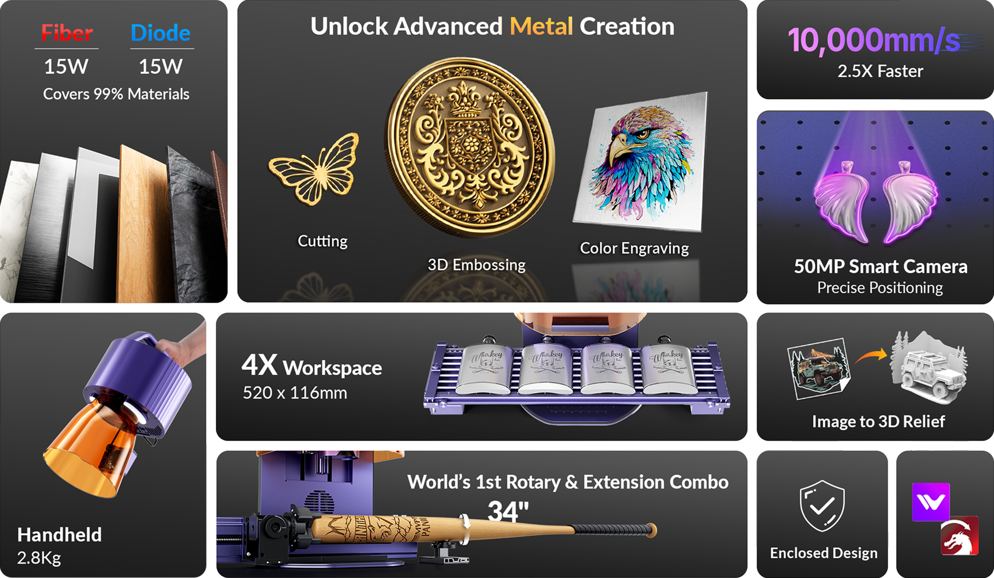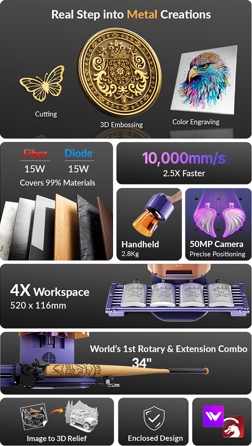- 15W Fiber Laser: Your first foray into metal creation, from deep engraving to 3D relief engraving.