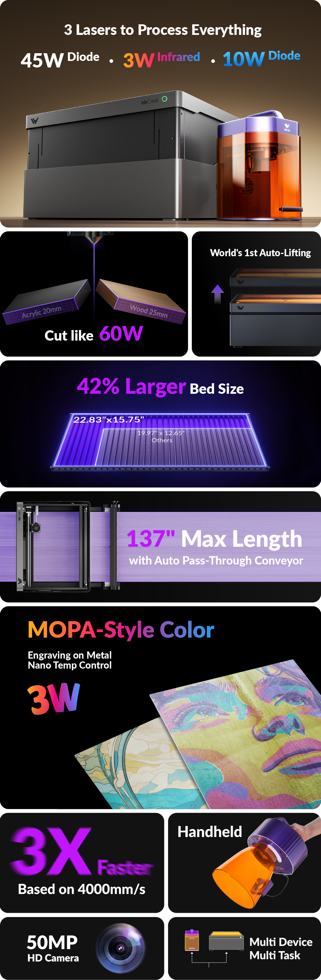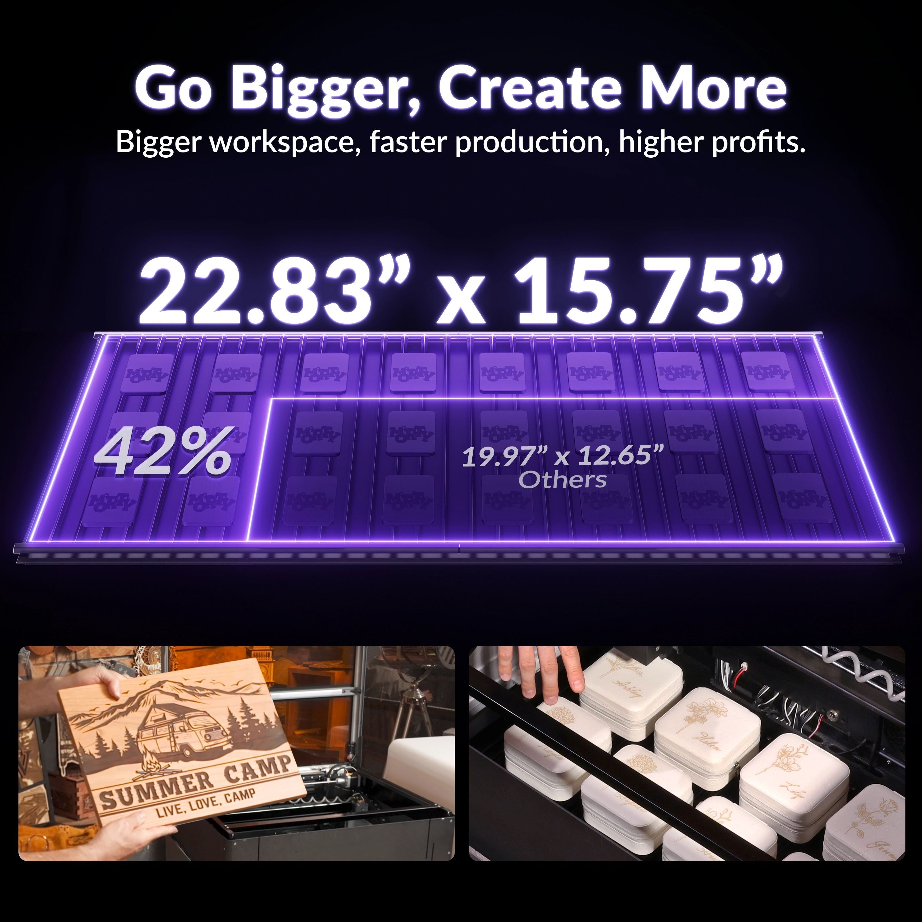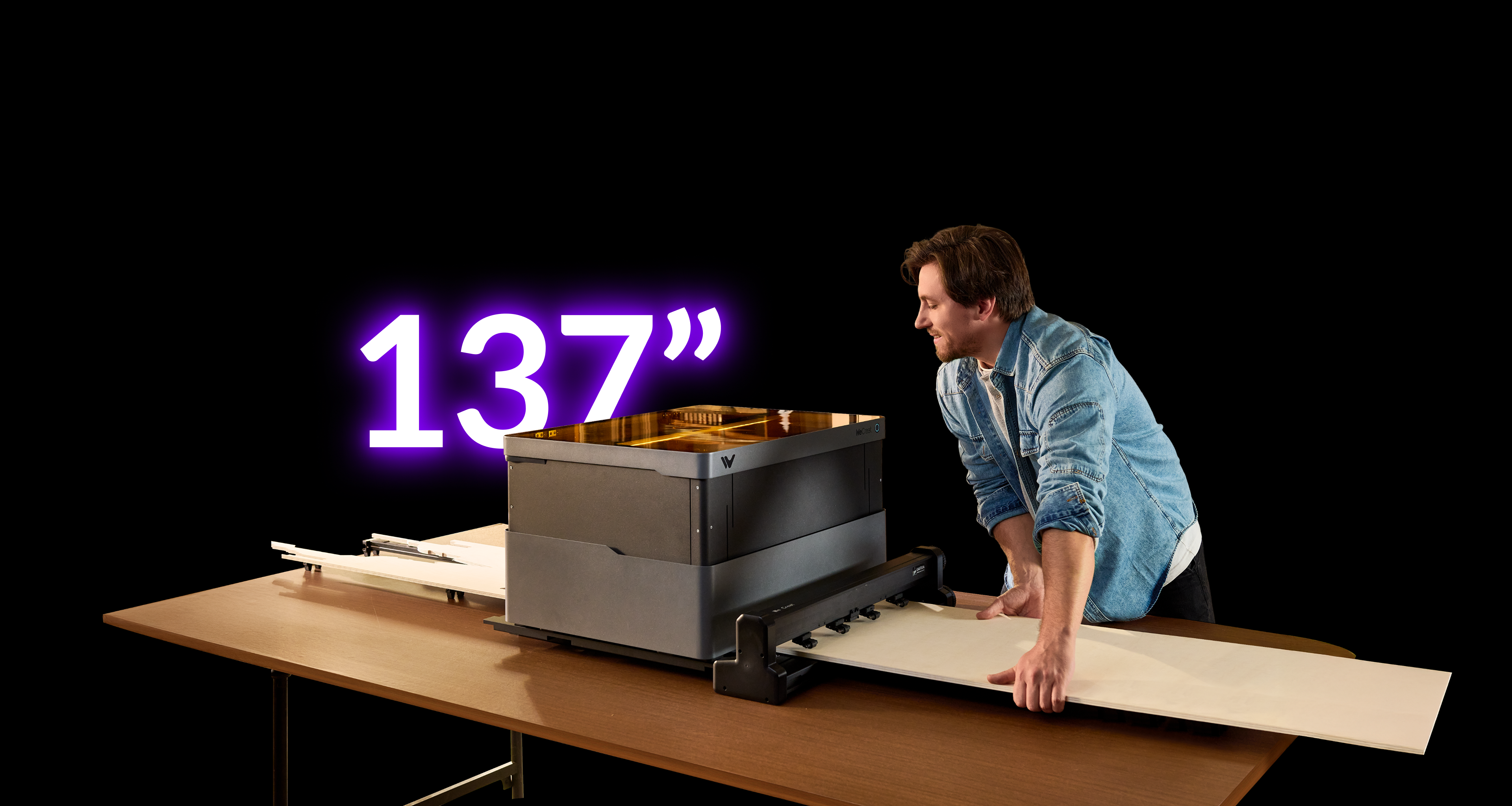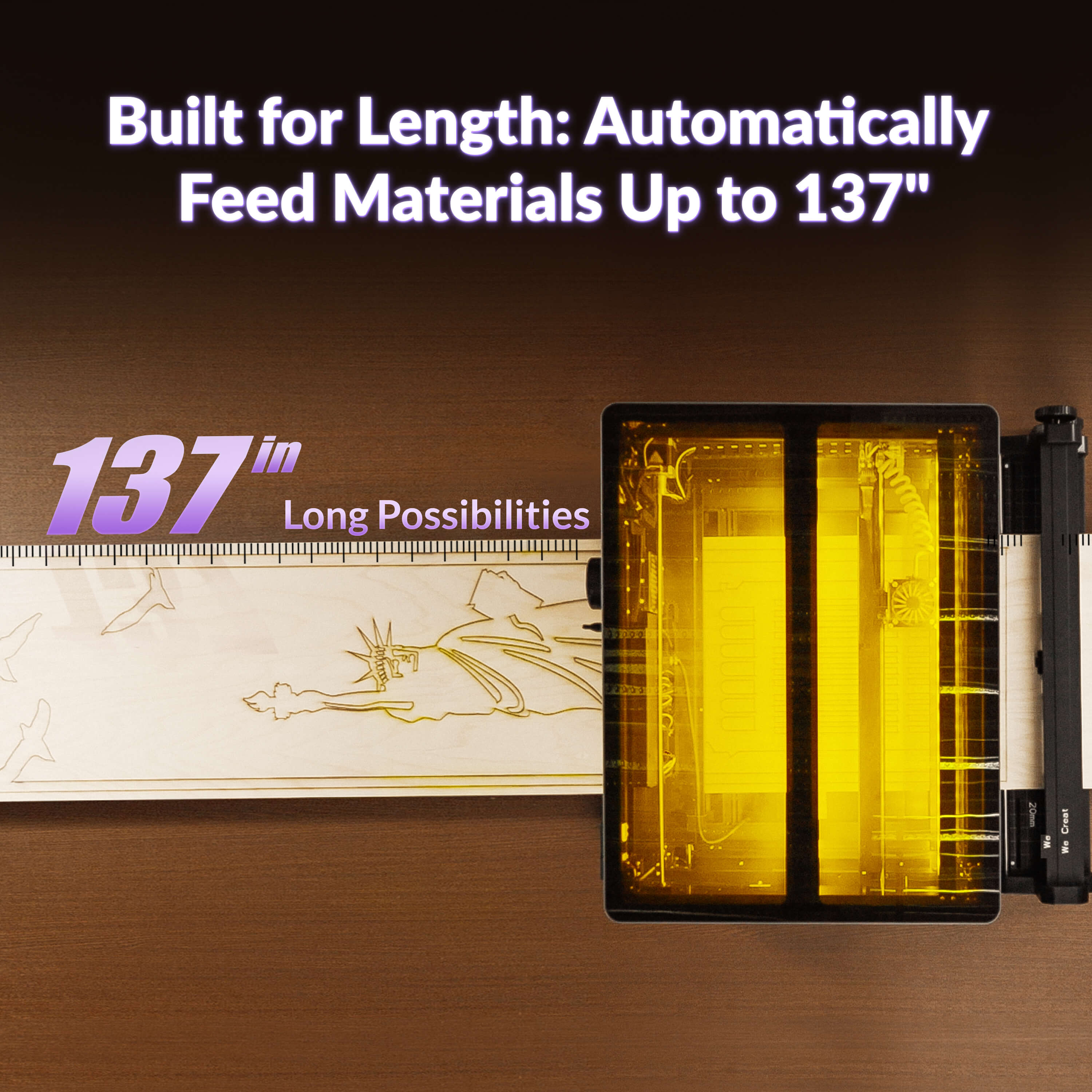 Versatility: A large working area and 137-inch auto pass-through feeder handle big projects. Plus, the Rotary Pro is the easiest-to-use rotary system, and you can easily switch to the 2W IR laser head for metal and plastic engraving, supporting 300+ materials.